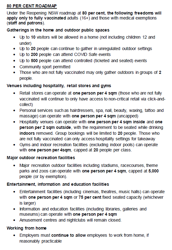 Under the 80 New South Wales Reopening Roadmap the following freedoms apply only to fully vaccinated adults 16 and medically exempt adults staff and patrons.